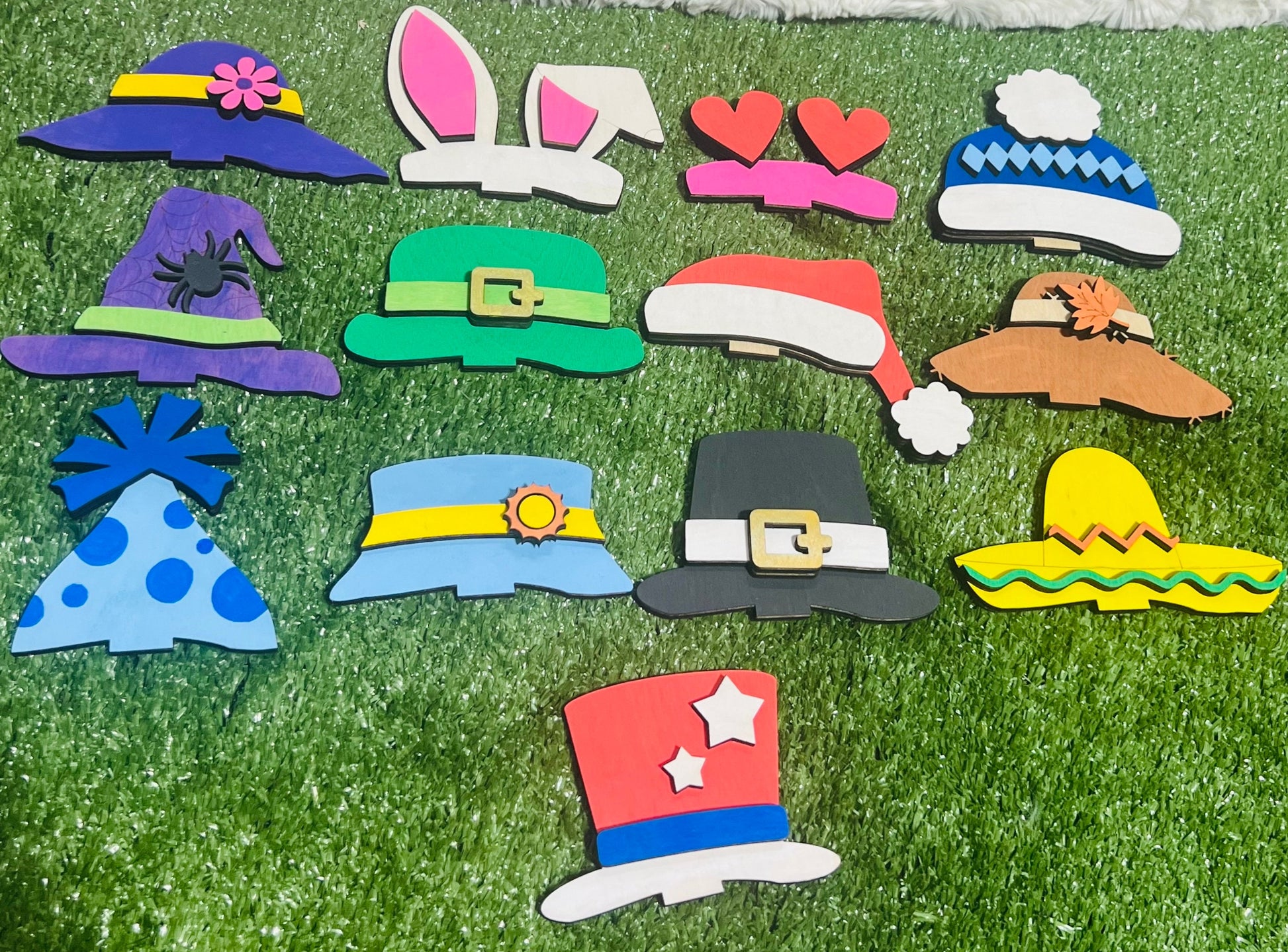 Each shelf sitter animal measures over 7-8" tall (not including hats) and 6" wide. Each sitter/hat is made of multiple layers of birch wood and acrylic paint, laser cut and hand painted. Each animal comes with 13 hats for each season: